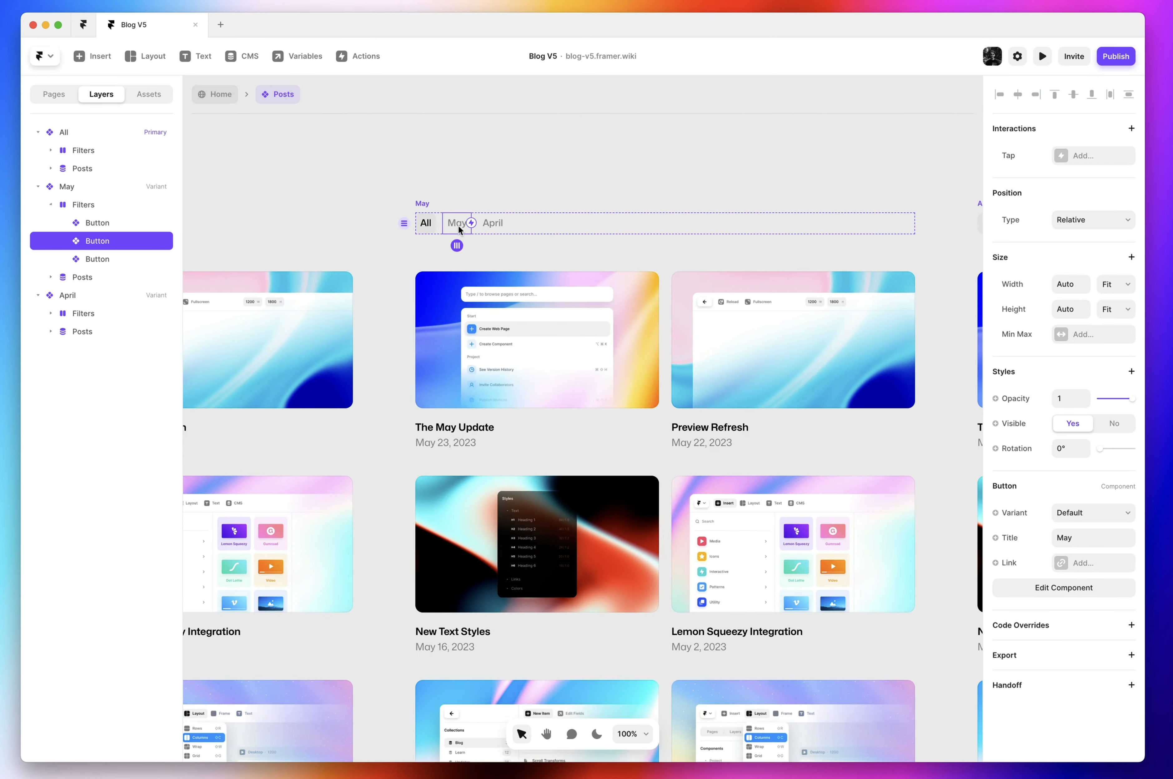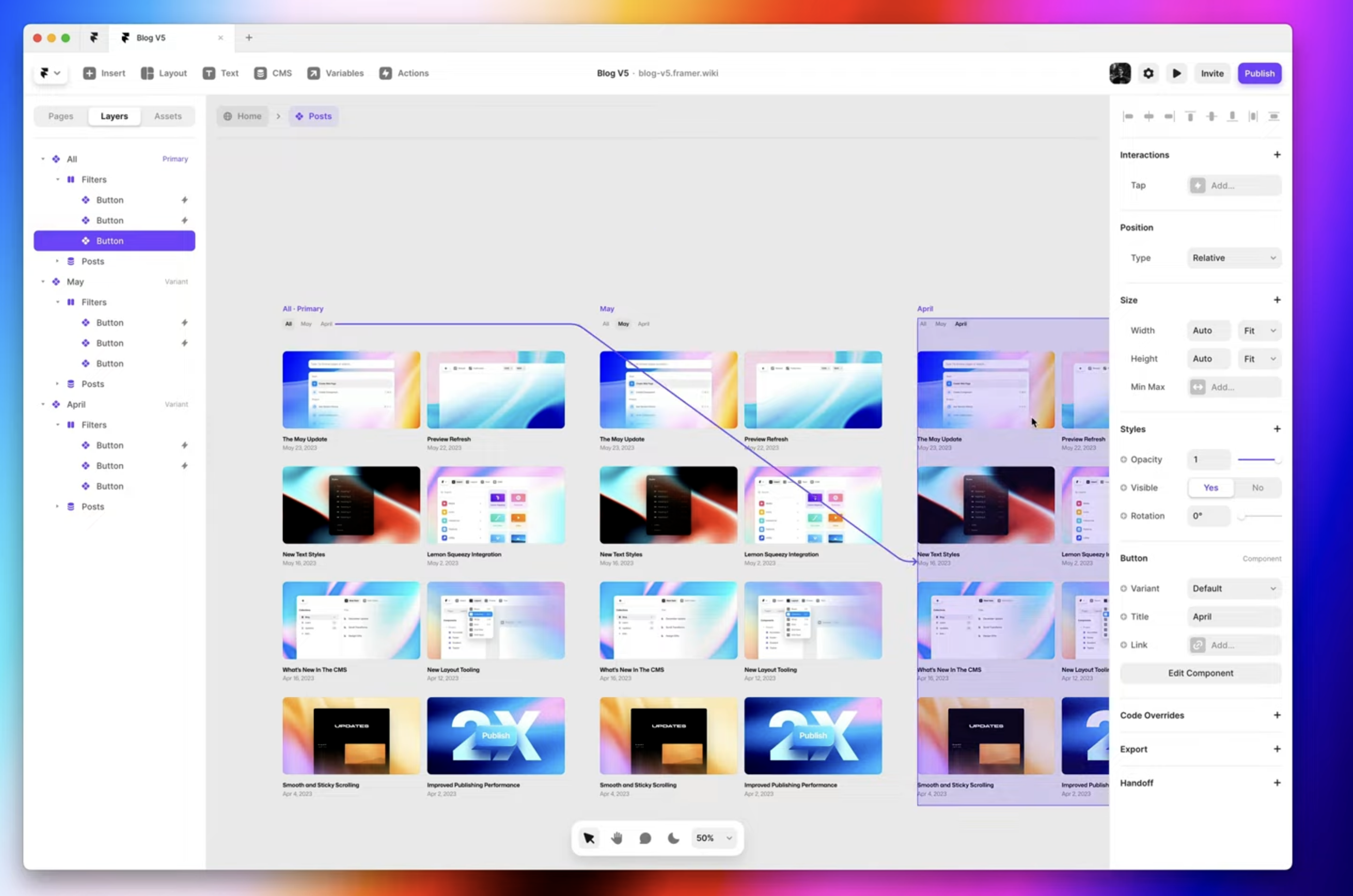 - 버튼과 변형 연결: 각 필터 버튼을 선택한 뒤 해당 변형(variant)으로 링크합니다. 예를 들어, 'April' 버튼은 'April Variant'에 연결하고, 'May' 버튼은 'May Variant'에 연결합니다.