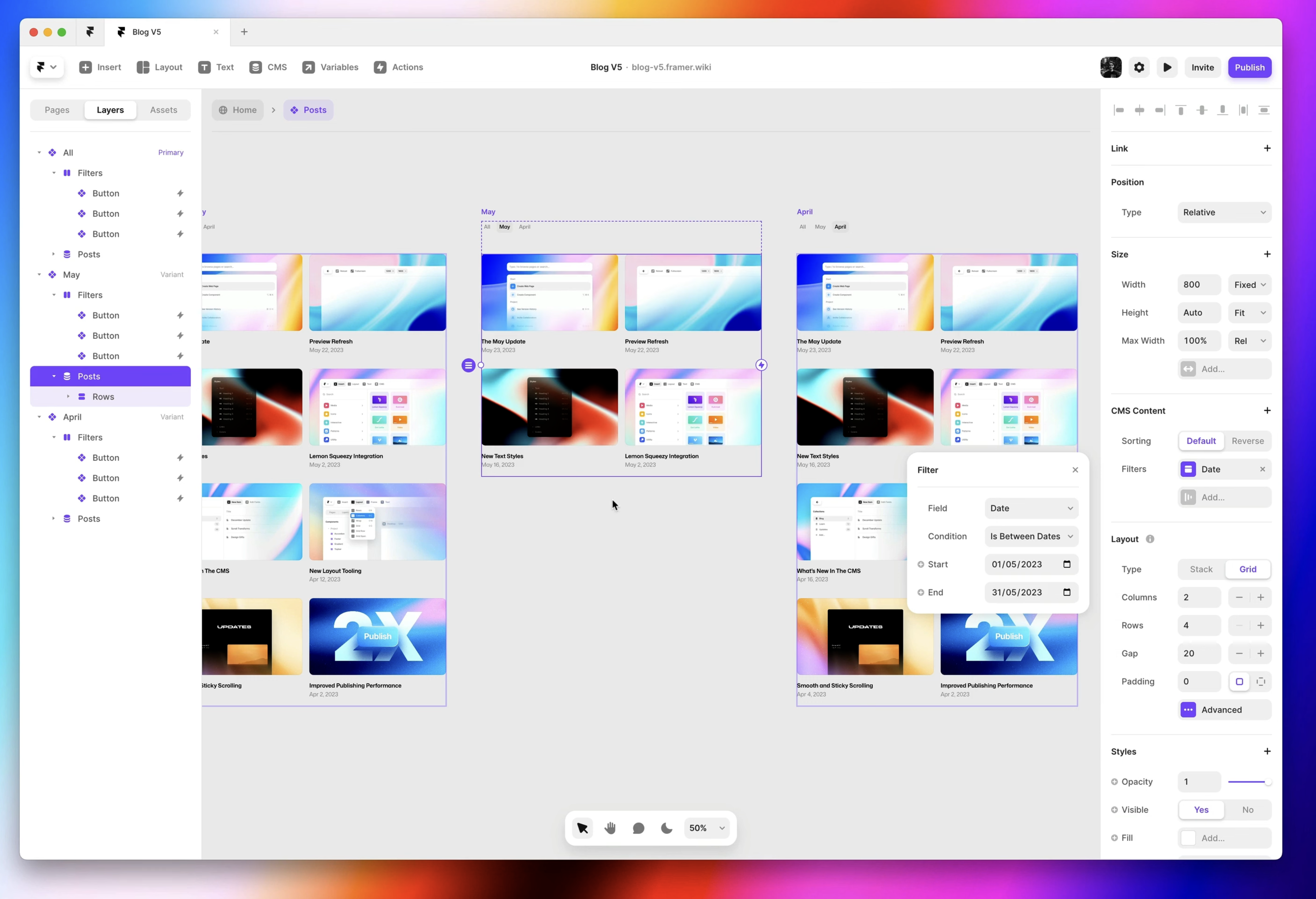 - 동일한 방식으로 다른 변형에 필터 적용: May 변형에도 같은 방식으로 'is between dates' 조건을 설정해 5월의 게시물만 표시되도록 합니다.