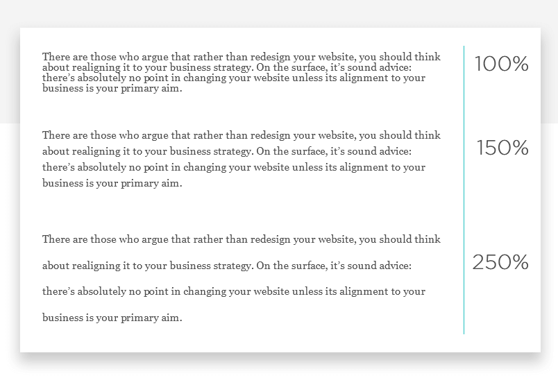 100% 단락에서, 여러분은 인접한 줄에 있는 글자들이 서로 위험할 정도로 가까이 오는 것을 볼 수 있습니다. 이것이 문제가 되는 이유는 약간의 시각장애가 있는 사람들은 읽기가 훨씬 더 어려워질 것이기 때문이다. 150%로 공간의 균형이 잘 잡혀 있고 텍스트를 읽을 수 있는 것처럼 느껴집니다. 반면 250% 띄어쓰기의 문단은 줄 간격이 너무 과장되어 텍스트를 읽는 것이 부자연스럽게 느껴진다. — 줄 간격 형식에 대한 UX 모범 사례 justinmind.com