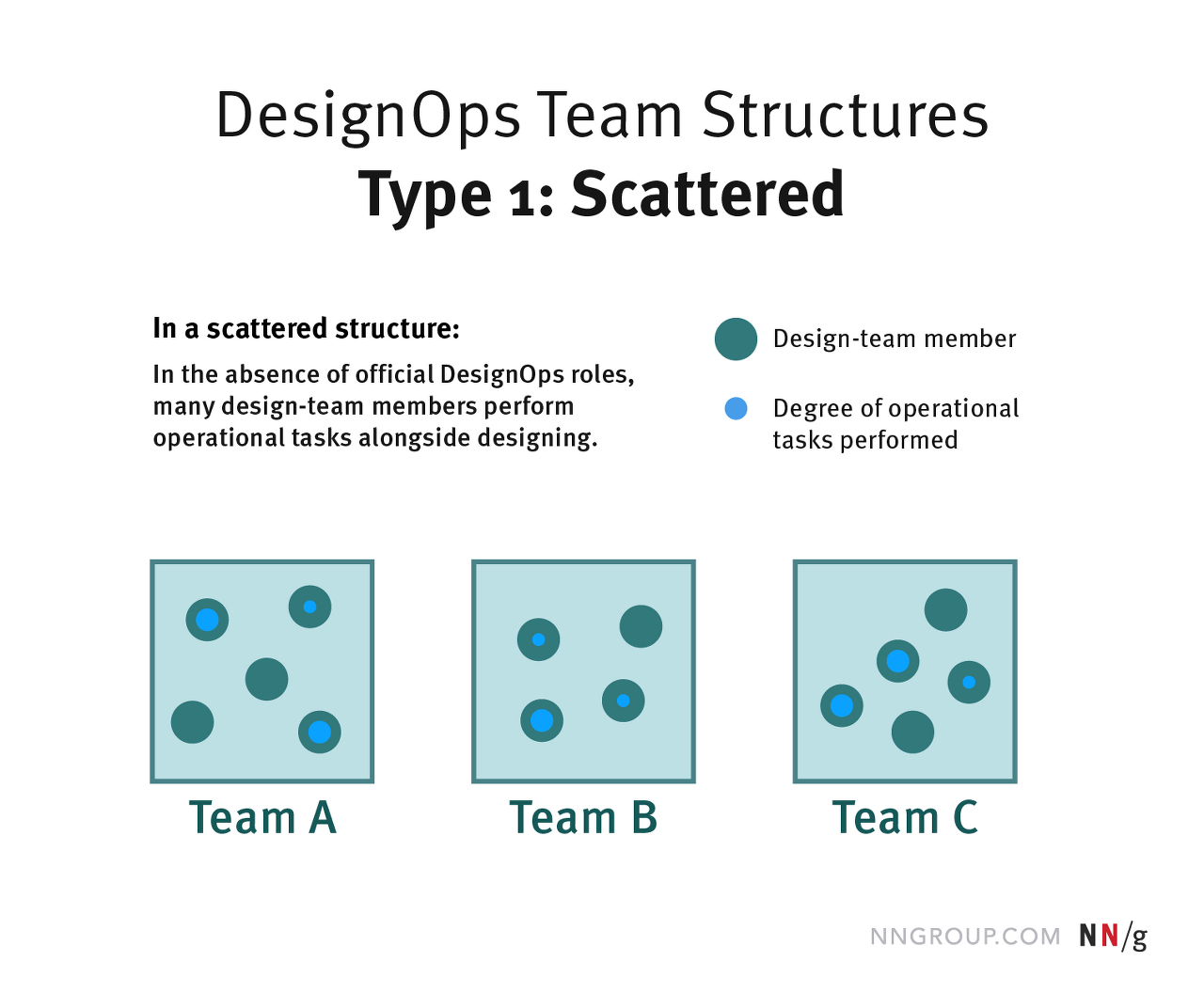 - Scattered(산발형): DesignOps의 노력은 일상적인 업무 책임의 일부로 다른 역할(예, 디자인 매니저)에 의해 수행된다. 조직 내에서 “DesignOps”는 용어로 사용되지 않고 형식화 된 개념으로 알려지지 않았을 가능성이 큼