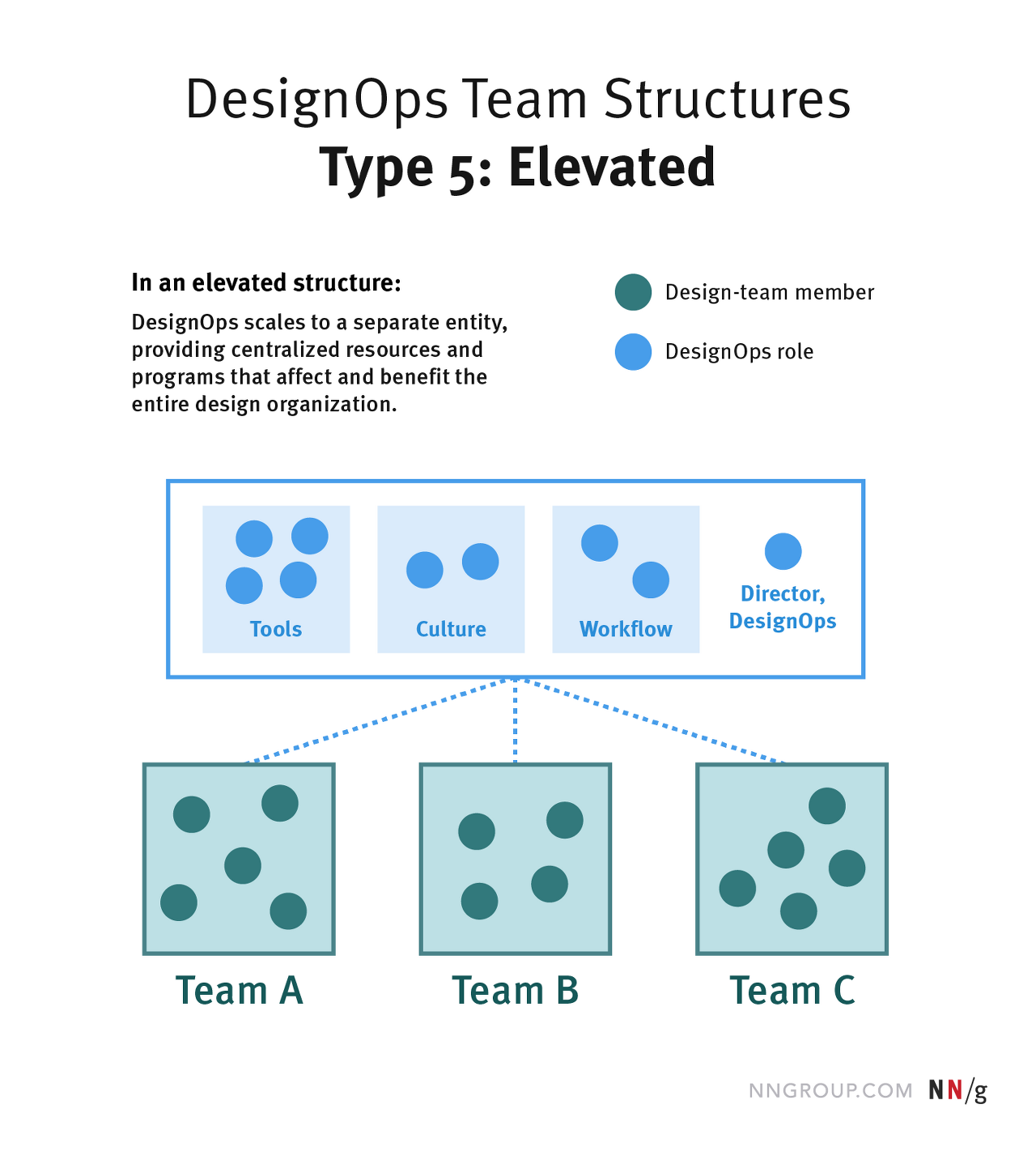 - 이러한 구조는 성숙도 모델이 아닙니다. 이러한 DesignOps 구조는 DesignOps 성숙도와 반드시 일치하지는 않습니다. 일부 팀의 경우 DesignOps의 전담 역할(즉, 단독형 구조)이 적절한 수준의 지원입니다. 따라서 높은 구조가 없다고 해서 DesignOps 관행이 성숙하지 않은 것은 아닙니다. 구조는 현재 및 가까운 미래의 조직 요구 사항을 기반으로 해야 합니다.