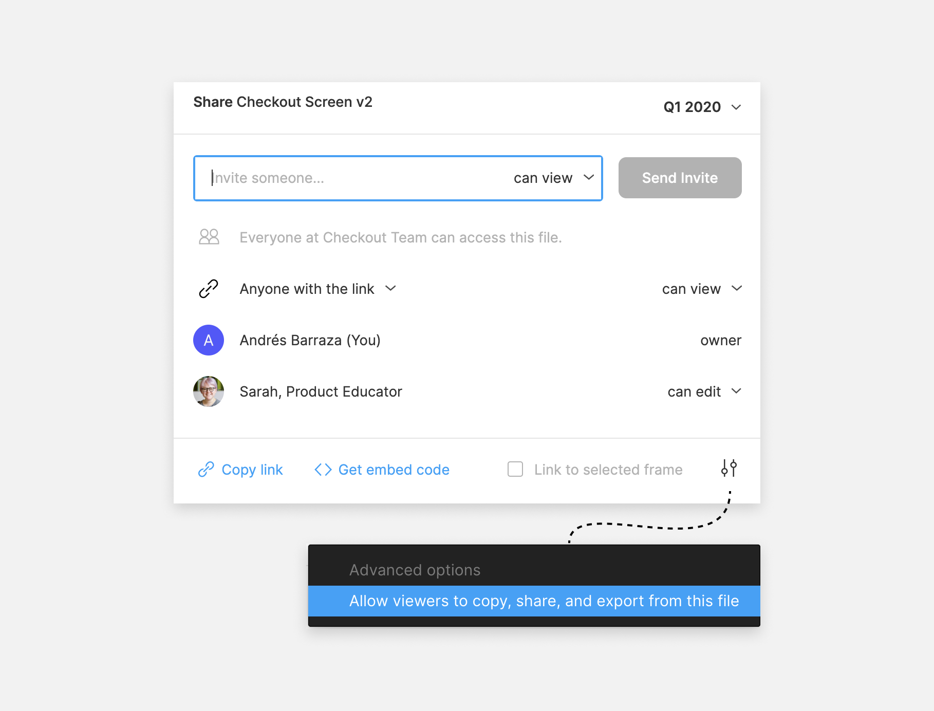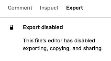파일 복사 및 공유가 제한되면 can edit 권한을 가진 작업자들의 Inspect 패널에 "Export disabled - This file's editor has disabled exporting, copying, and charing" 메시지가 뜹니다.
